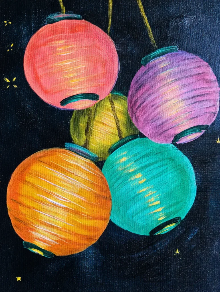 This delightful painting captures a group of vibrant paper lanterns hovering against a deep, dark background. The lanterns feature horizontal brushwork that mimics the crinkled texture of paper, rendered in a cheerful palette of coral, teal, purple, and gold. Each sphere is grounded by simple teal bands at the top and bottom, suspended by thin lines that draw the eye upward. Tiny, golden star-like marks are scattered across the dark space, adding a magical touch to the overall composition.