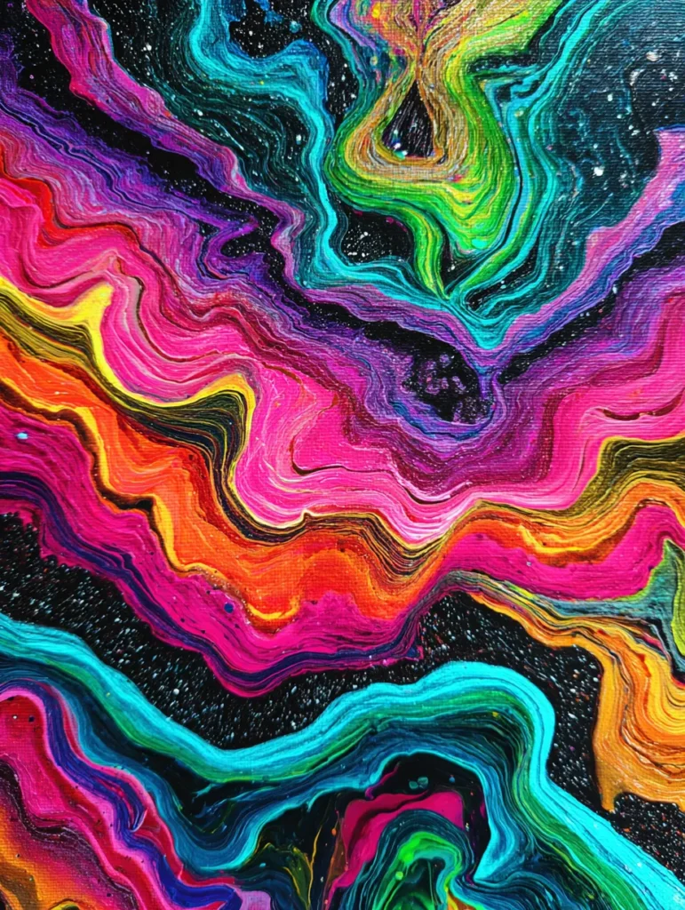 This design features a high-energy explosion of colors that ripple across the canvas like molten liquid. Intense streaks of hot pink, acid green, bright orange, and electric blue weave through deep black channels to create a mesmerizing sense of depth. The composition relies on organic, flowing lines that mimic the look of natural agate or marble formations. Every curve pulls the eye in a different direction, making the piece feel alive and full of constant movement.
