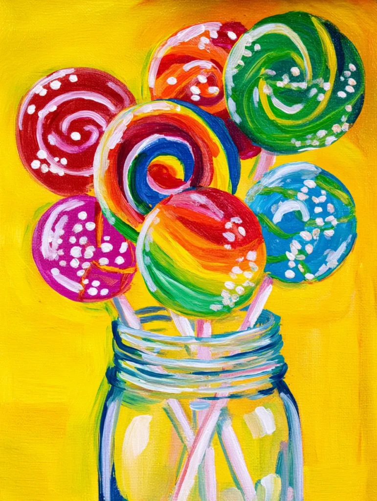 This cheerful painting celebrates pure joy with a cluster of vibrant lollipops arranged in a clear glass mason jar. Each candy swirl pops against a bright sunny yellow background, featuring saturated reds, greens, pinks, and rainbow gradients. The brushwork remains loose and expressive, giving the lollipops a textured, sugary appearance that feels almost good enough to eat. White dabs of paint accent the candy surfaces to suggest a crystalline, glistening effect, while the simple jar at the base keeps the composition focused and sweet.