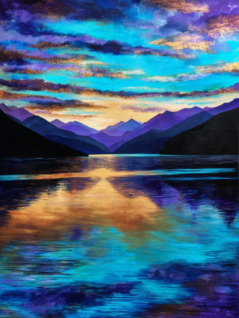 I find that painting scenes like this is the perfect remedy for a busy day. Being able to blend those fiery sunset tones into the cool dark water provides such a soothing rhythm to my brushwork. Sitting down with this canvas helps me disconnect from everything else and just focus on how the light plays across the peaks.