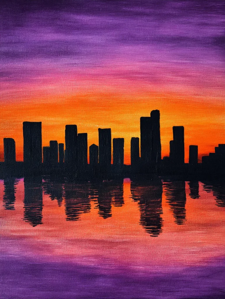 This artwork showcases a bold cityscape silhouette set against a brilliant gradient sky that transitions from deep violet to fiery orange. The urban structures are rendered in solid black, providing a sharp contrast to the glowing background, while their reflection shimmers across a calm body of water at the bottom of the frame. Smooth, horizontal blending techniques create an atmosphere of quiet dusk, making the vibrant colors pop with impressive intensity. It is a minimalist composition that proves you do not need complex details to make a significant impact on your wall.