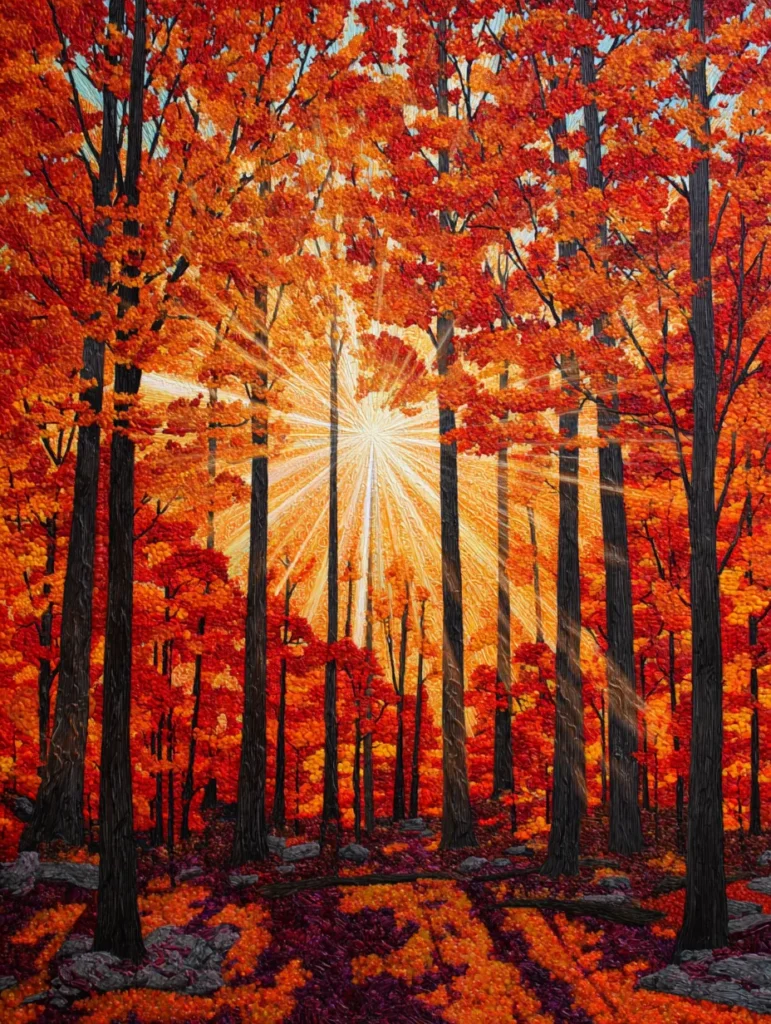 This piece captures the fiery heart of fall with a dense canopy of brilliant red and orange leaves that seem to glow from within. Slender, dark tree trunks rise vertically, creating a rhythmic structure that draws the eye toward a burst of sunlight piercing through the center. Intense golden light beams streak across the composition, highlighting the textured layers of foliage and the deep, earthy tones of the forest floor. The contrast between the dark bark and the saturated warmth of the leaves makes the scene feel incredibly immersive and vibrant.