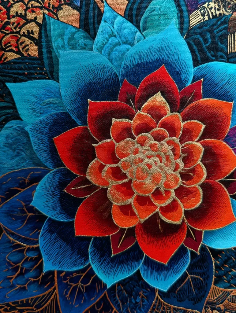 This intricate design centers on a large, layered flower that blends deep jewel tones with striking metallic outlines. Bright turquoise outer petals frame a core of burning reds and oranges, creating a sophisticated color contrast that feels both modern and timeless. Fine, etched-like lines define each petal, adding a sense of texture and precision that makes the blossom stand out from the textured background. The overall composition feels balanced and symmetrical, giving the piece a polished and intentional look.