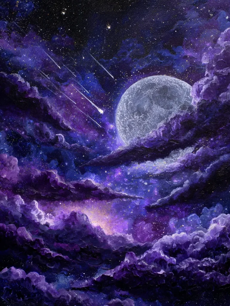 This dreamy canvas captures a magical night sky filled with billowing clouds in rich shades of violet and indigo. A large, textured full moon serves as the glowing focal point, while streaks of bright white light mark the path of falling meteors across the deep space backdrop. The brushwork creates soft, puffy cloud edges that add a lovely sense of depth and mystery to the scene. Specks of gold glitter catch the light just right, mimicking distant stars and giving the whole painting a shimmering finish that feels truly otherworldly.