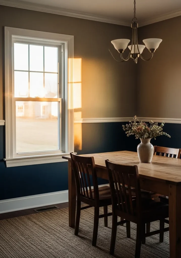 This dining room features a deep navy tone on the lower wall paired with a warm neutral shade above the chair rail. The contrast feels rich and classic without feeling too formal. Natural light from the window softens the darker color and highlights the wood dining table and chairs. The simple chandelier and woven rug add texture while keeping the overall look grounded and timeless.