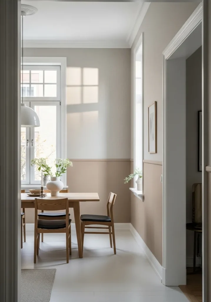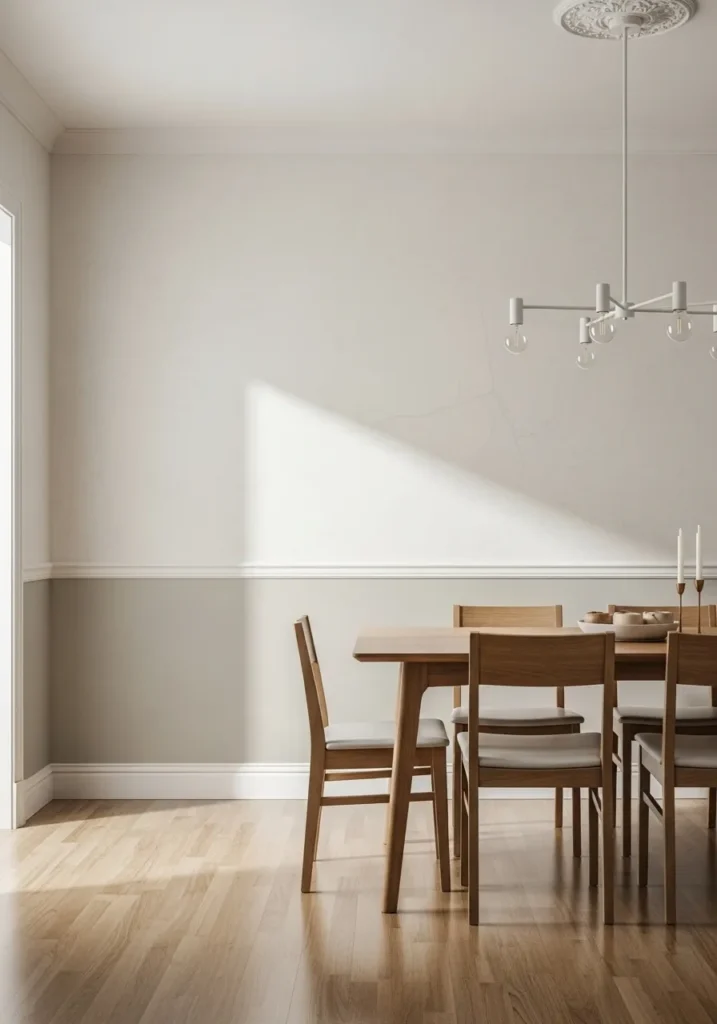This dining room combines a light neutral upper wall with a slightly warmer shade below the chair rail. The simple color split keeps the space feeling open and airy. Natural light reflects off the pale walls and highlights the clean trim work. Minimal furniture keeps the focus on the paint and architectural details.