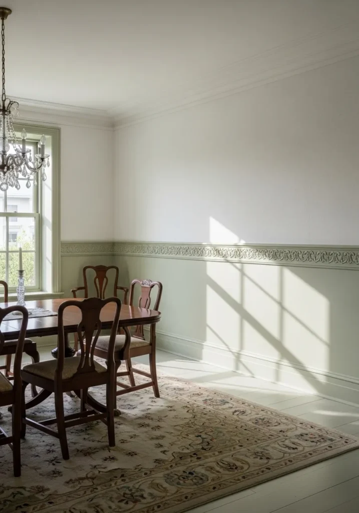 This dining room features a soft cream upper wall paired with a pale green lower section divided by an ornate chair rail detail. The decorative molding adds texture and old world charm without overwhelming the space. Natural light pours in through the tall window and casts gentle shadows across the walls. Classic wood furniture and a traditional chandelier complete the timeless look.