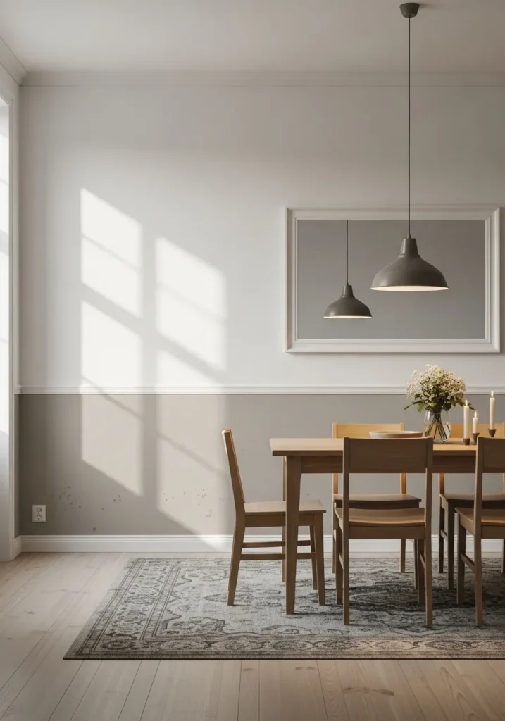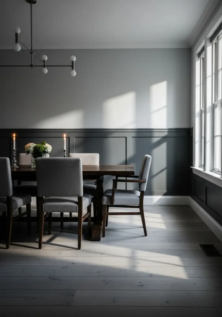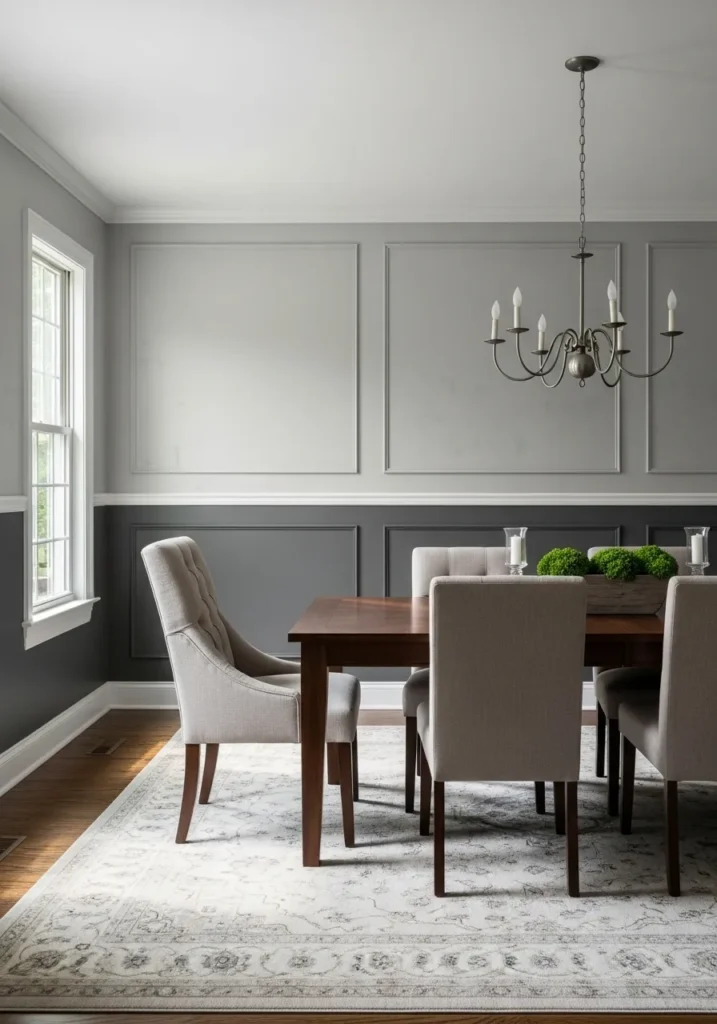 This dining room features a light gray upper wall paired with a darker gray below the chair rail. The contrast adds depth while still keeping the room classic and elegant. Upholstered chairs and a simple chandelier enhance the refined look. Natural light keeps the darker tone from feeling heavy.