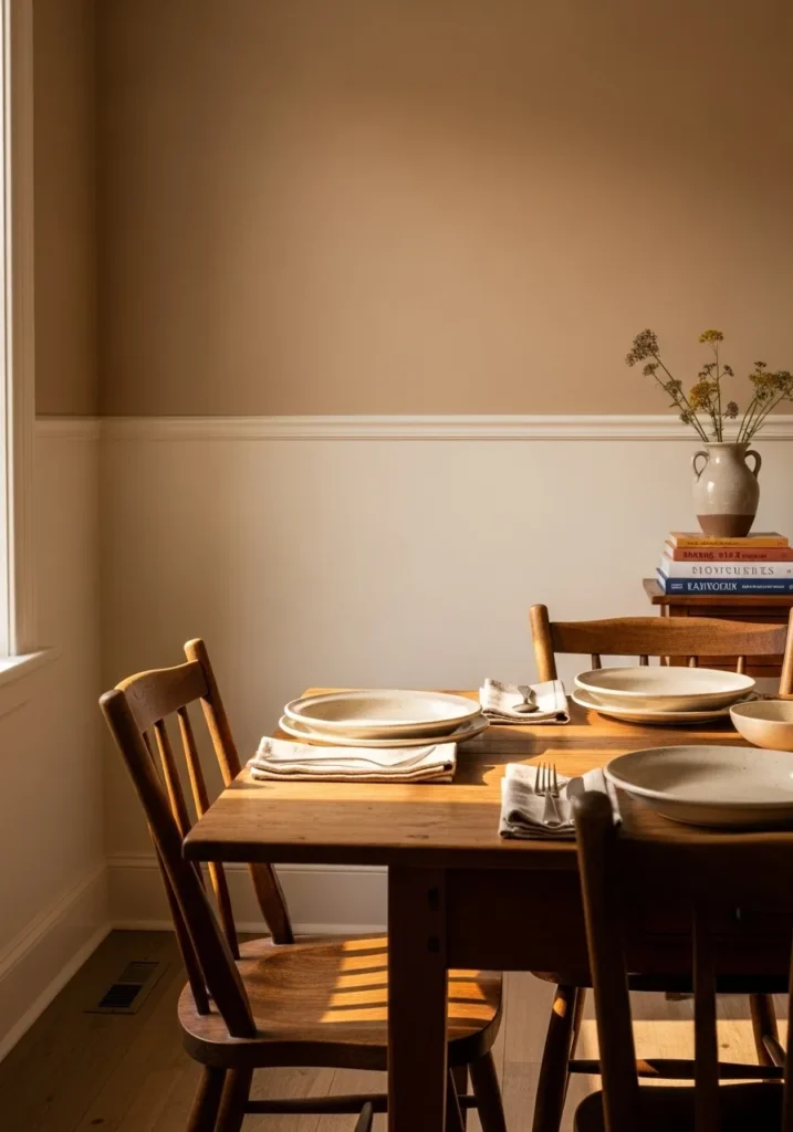 This dining room features a warm tan upper wall paired with a clean white lower section divided by a simple chair rail. The natural light highlights the warmth of the paint and brings out the beauty of the wooden table and chairs. The overall look feels relaxed and classic with a subtle cozy vibe. Everything feels balanced without trying too hard.