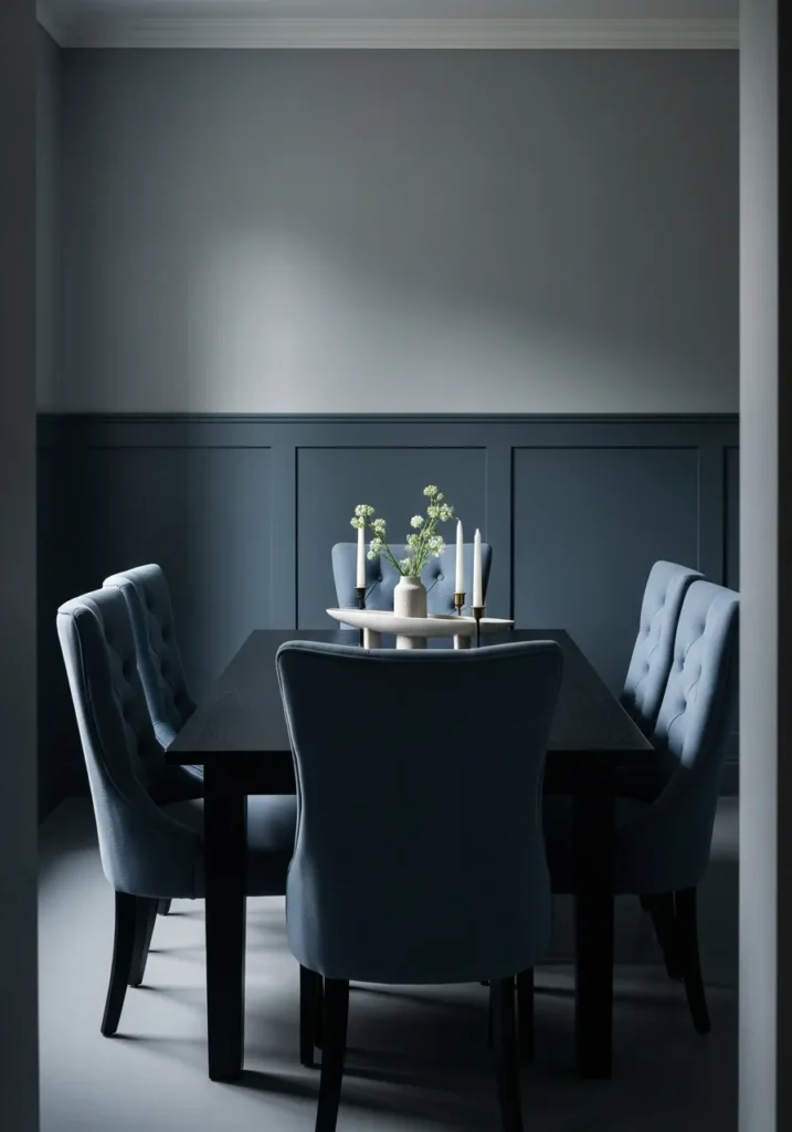 This dining room uses a deep charcoal tone below the chair rail with a softer gray above. The darker lower wall creates a bold foundation while still keeping the space classic. The dark dining table and upholstered chairs blend seamlessly into the palette. Soft light gives the room a calm and moody atmosphere.