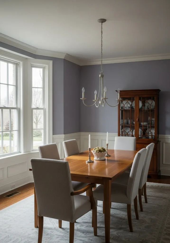 This dining room features a muted lavender upper wall with a crisp white lower section. Large windows let in plenty of light which keeps the color feeling airy and soft. Traditional furniture and a glass front cabinet enhance the classic feel. The overall look is elegant but approachable.