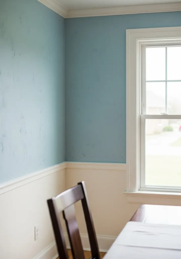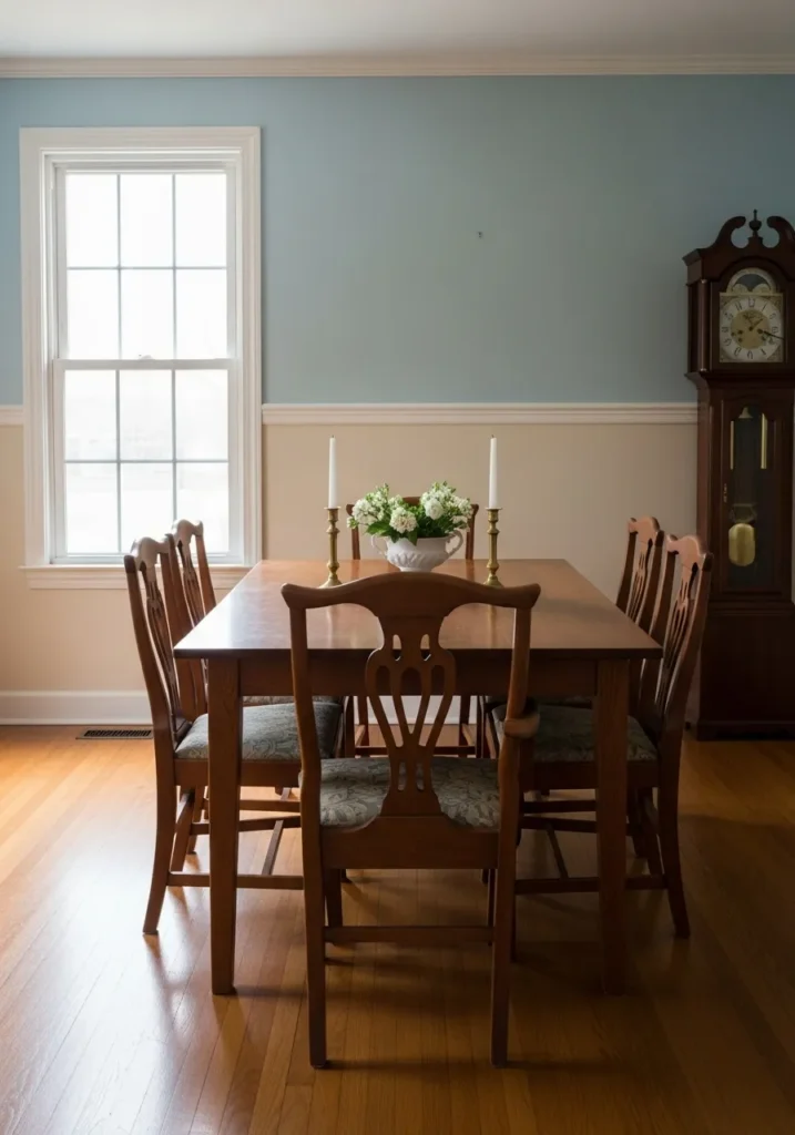 This dining room features a pale blue upper wall with crisp white below the chair rail. The soft color works beautifully with the warm wood furniture and vintage clock. Light from the window makes the blue feel calm and airy. The space feels classic and welcoming.