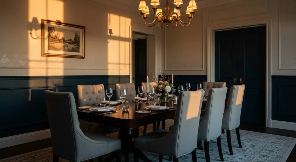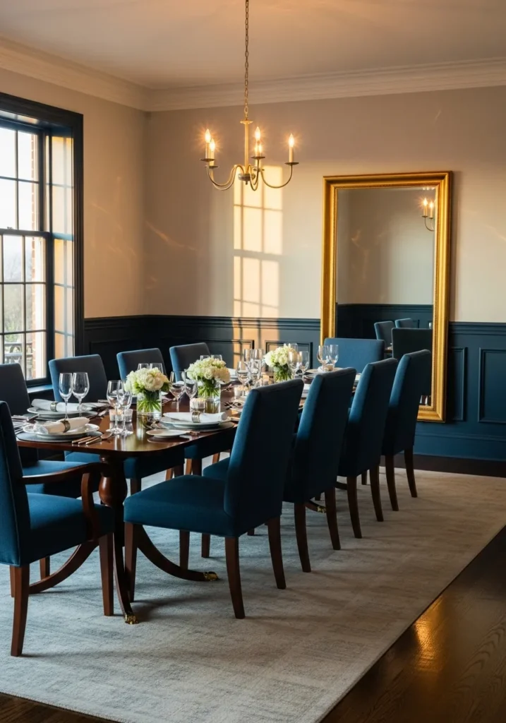 This dining room uses a rich blue on the lower wall paired with a warm neutral above the chair rail. Upholstered chairs and a long dining table create a formal and elegant look. The chandelier and mirror add a touch of drama without feeling overdone. The space feels refined and well balanced.