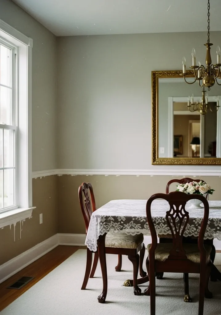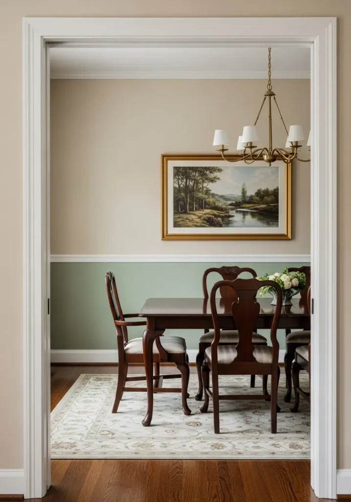 This dining room features a muted sage green above the chair rail with a soft cream tone below. The colors feel calm and classic and work beautifully with the antique style table and chairs. Natural light from the tall window brightens the space and highlights the subtle contrast between the walls. A gold framed mirror and delicate chandelier add a quiet sense of elegance.