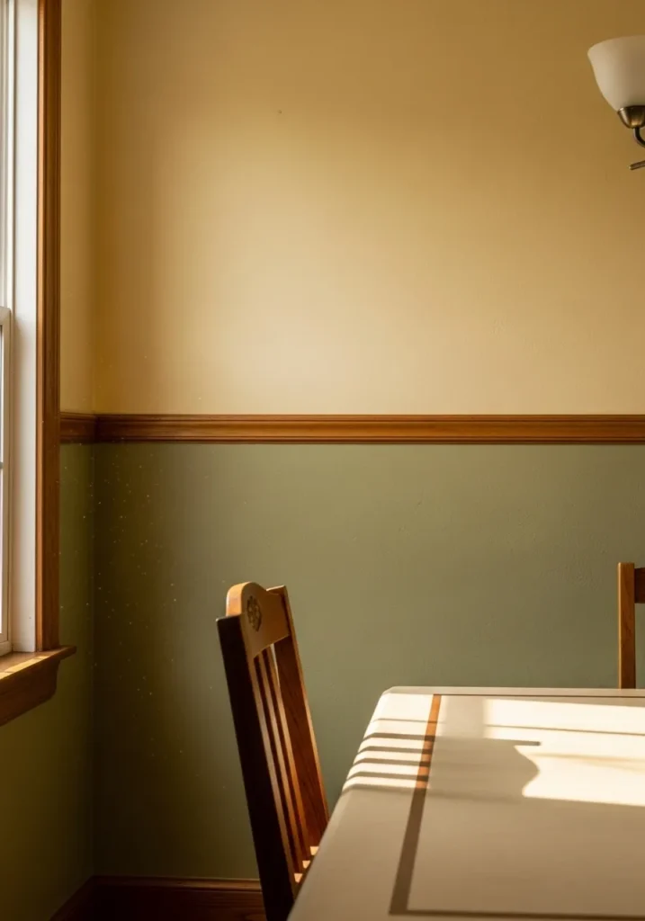 This space uses a soft olive green below the chair rail with a warm cream tone above. The sunlight pouring in from the window makes the colors glow in a really gentle way. The wooden chair rail blends beautifully with the dining furniture and keeps the look cohesive. Everything feels calm and slightly traditional with a relaxed everyday charm.