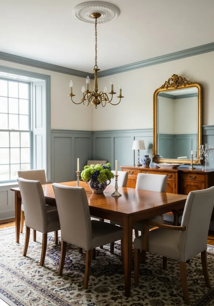 This dining room uses a pale blue on the lower walls paired with a warm neutral above the chair rail. The color combination feels fresh yet rooted in tradition. Upholstered chairs and a solid wood table bring softness and balance to the space. The patterned rug ties everything together and adds visual warmth.