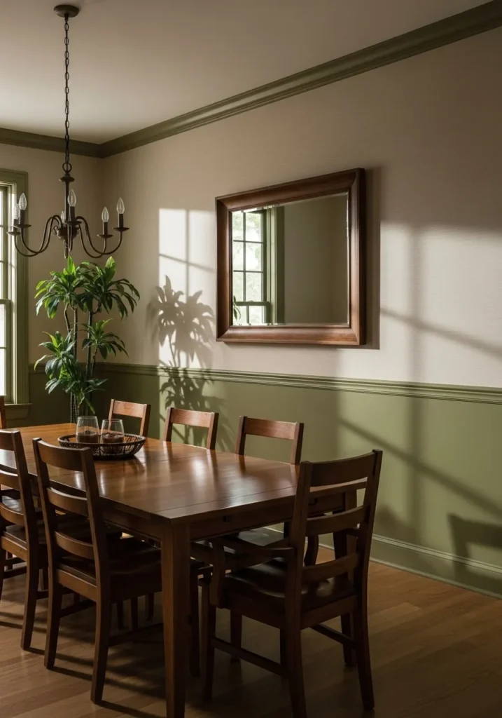 This dining room features a soft olive green below the chair rail with a creamy neutral tone above. Sunlight creates gentle shadows across the walls and brings the green to life. Simple wood furniture and minimal decor keep the focus on the paint colors. The overall look feels grounded and inviting.