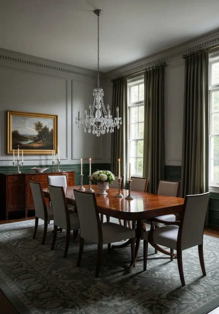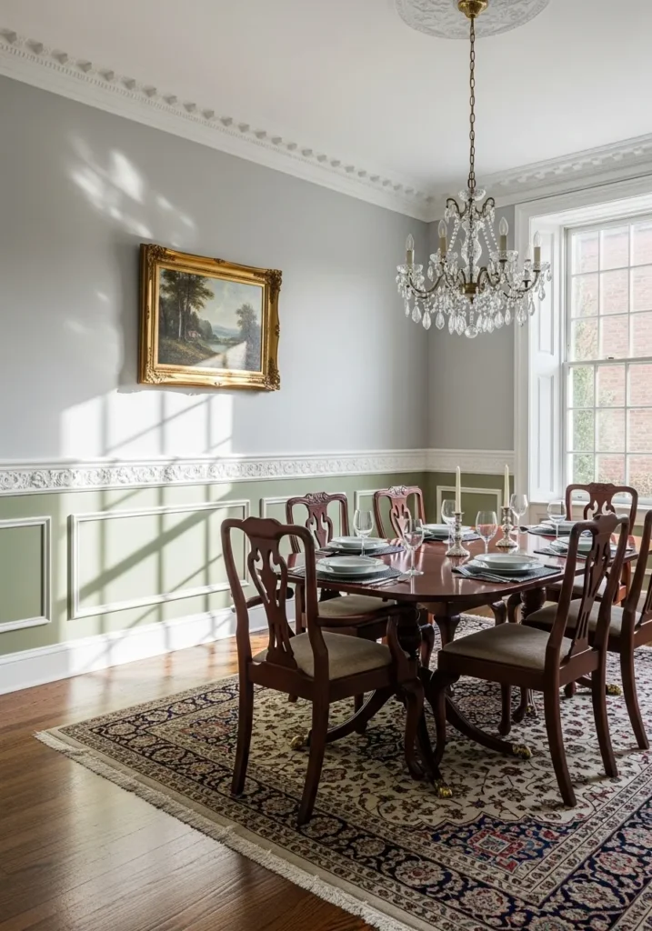 This space uses a light gray upper wall with a pale green tone below the chair rail. Decorative molding and traditional trim give the room a refined and historic feel. A crystal chandelier and antique style dining set reinforce the classic look. Natural light keeps the colors soft and balanced.
