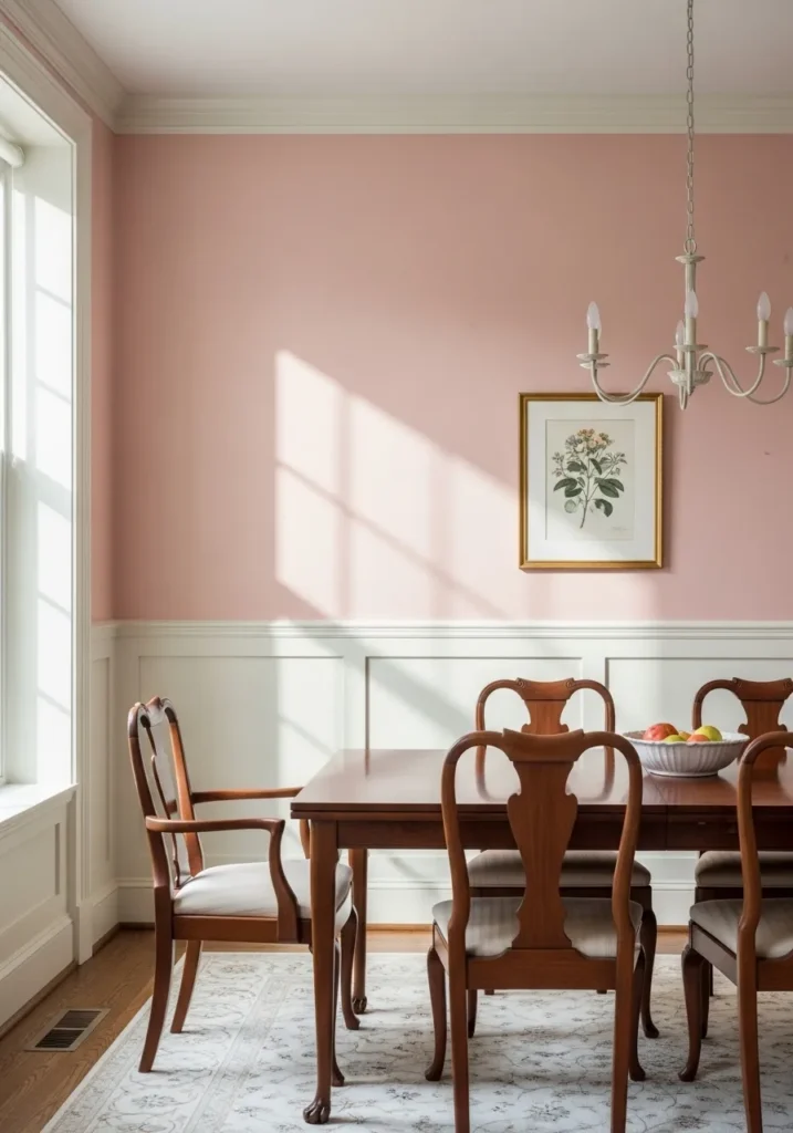 This dining room uses a gentle blush pink above the chair rail with crisp white paneling below. The natural light highlights the softness of the color and keeps it from feeling too sweet. Classic wooden chairs and a simple chandelier ground the look and add warmth. The overall feel is light, elegant, and very welcoming.