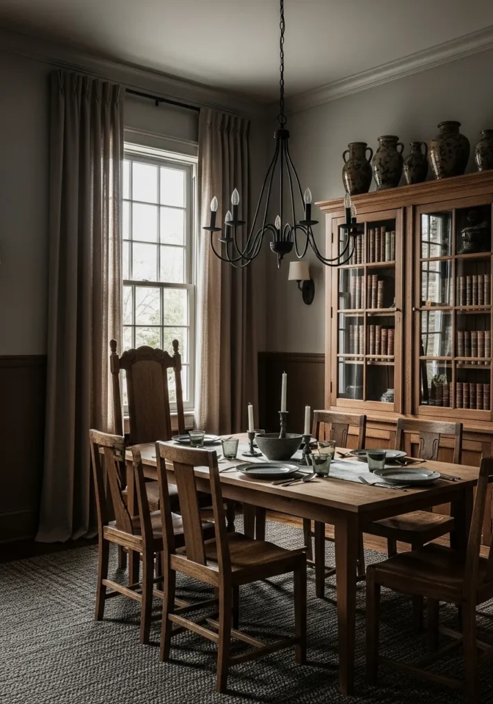I find this design incredibly comforting. The darker tone makes the space feel grounded and intimate. It has that old home charm that feels familiar and safe. This is the kind of dining room that feels better the longer you sit in it.