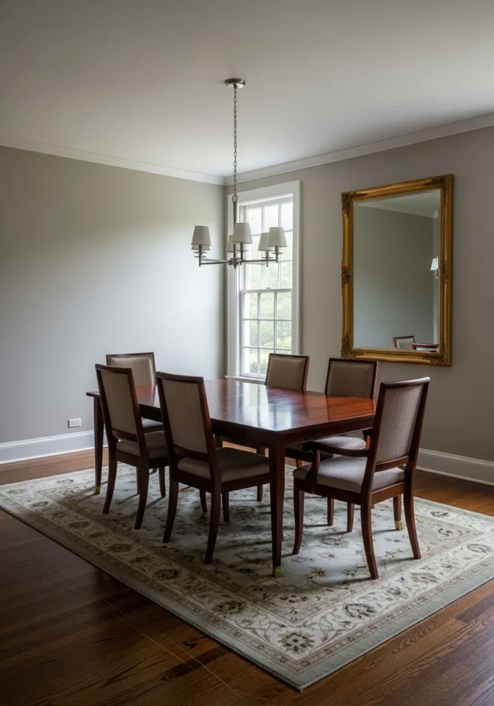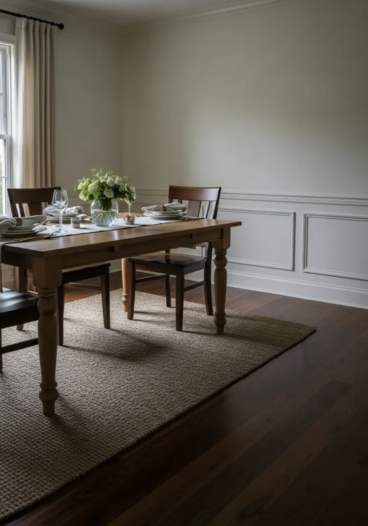 Light greige walls soften the look of the dark floors in this classic dining room. Traditional furniture and a simple rug add structure without making the space feel formal. The neutral palette keeps everything feeling balanced and timeless.