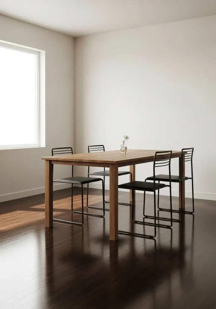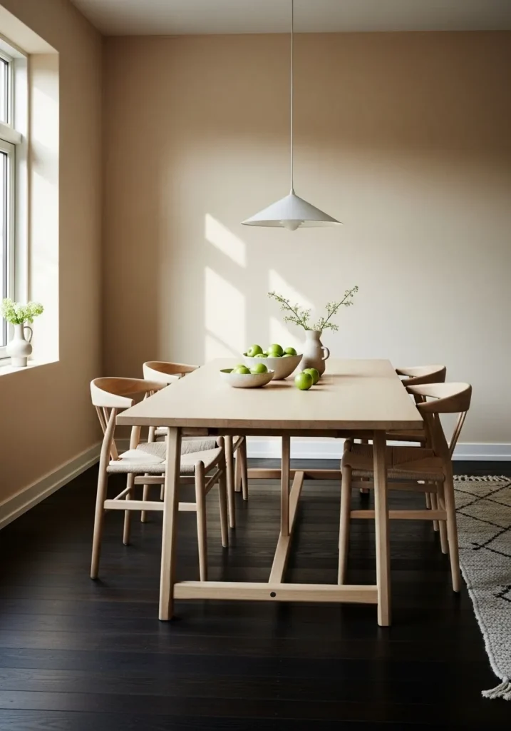 Soft beige walls pair beautifully with dark floors and light wood furniture. The simple table and chairs give the room a clean Scandinavian inspired look. Sunlight adds warmth and keeps the space feeling open and airy.