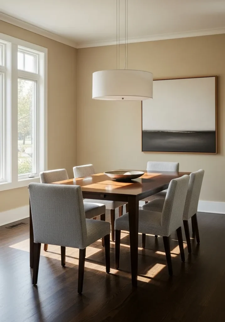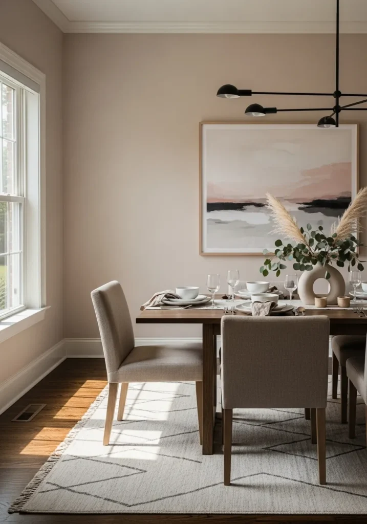 Soft blush beige walls bring a gentle warmth to this dining room while letting the dark floors ground the space. The clean lined table, upholstered chairs, and subtle artwork keep everything feeling modern but still approachable. Natural light softens the color and adds an airy feel without washing it out.
