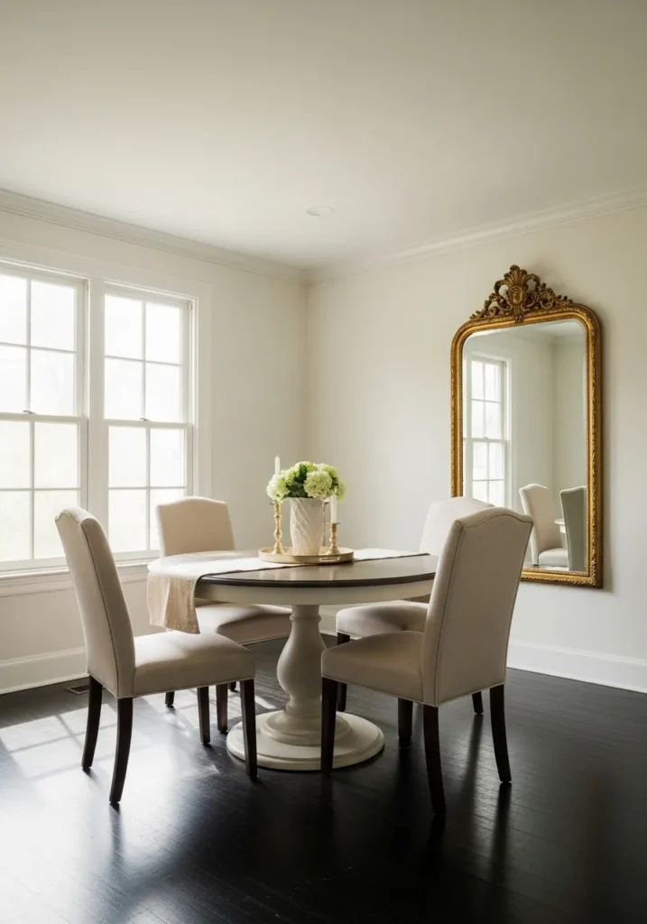 Warm ivory walls brighten the room and create a lovely contrast with the dark flooring. The round table and upholstered chairs add softness while the vintage style mirror brings in character and charm. Light from the windows keeps everything feeling open and calm.
