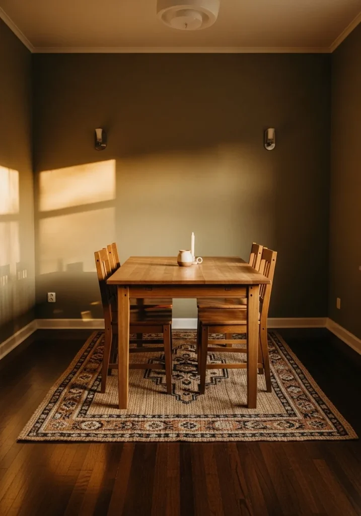 Muted olive walls add warmth and depth without feeling too heavy against the dark floors. The simple wood table and patterned rug bring texture and comfort to the space. Soft shadows from natural light create a cozy and intimate atmosphere.