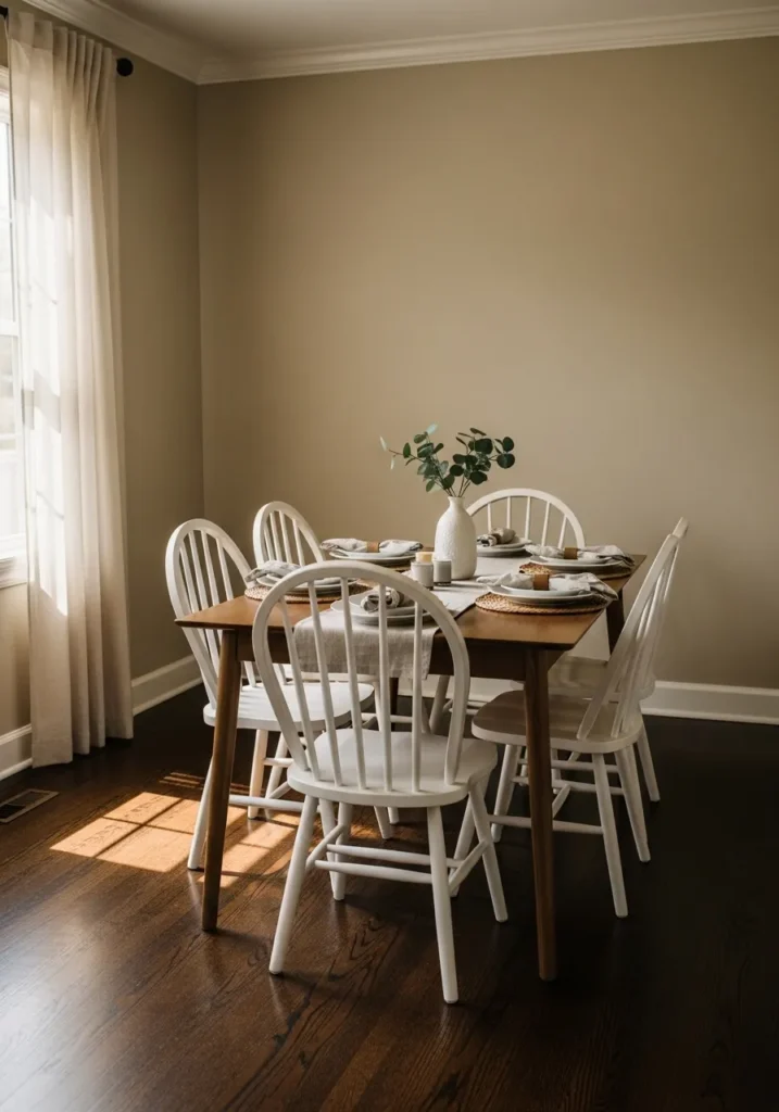 Warm taupe walls pair beautifully with the dark floors and light wood dining set. The mix of tones keeps the room feeling balanced and approachable. Soft curtains and natural light add an easy softness to the overall look.