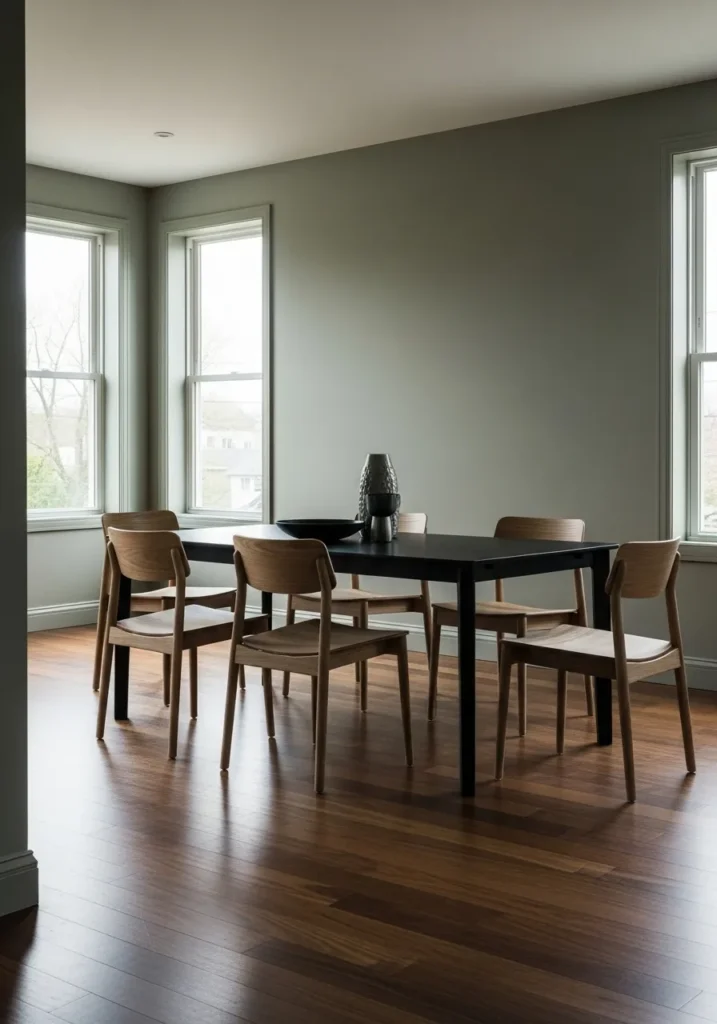 Muted sage green walls bring a fresh but grounded vibe to this dining room. The dark floors add richness while the simple wood table and chairs keep everything feeling warm and welcoming. Tall windows and clean lines help the color feel airy instead of heavy.