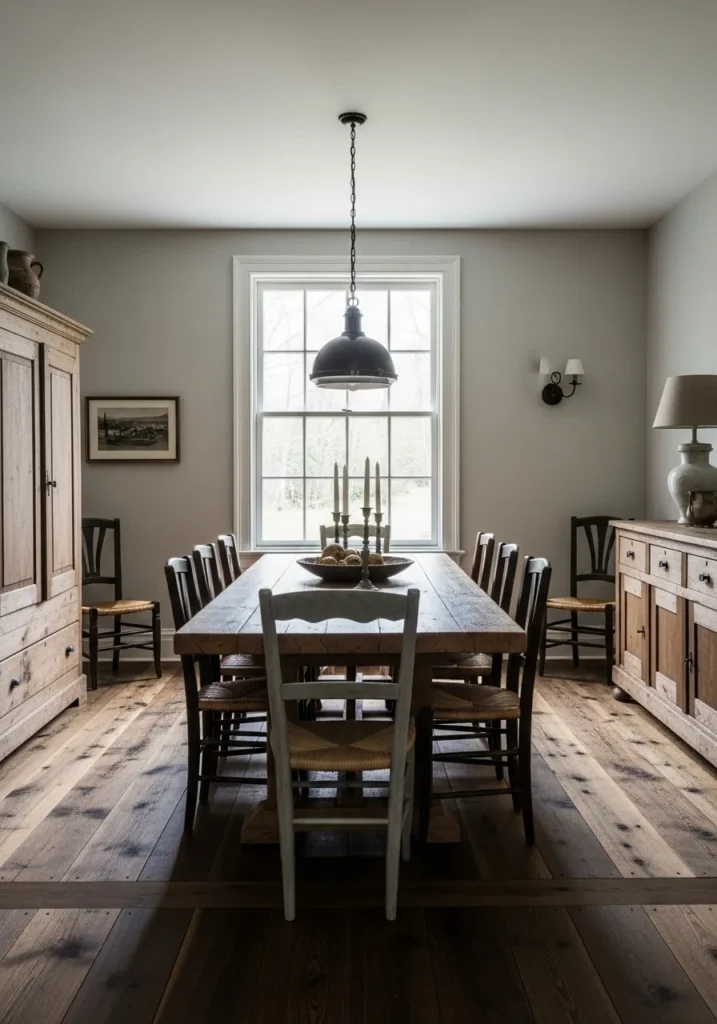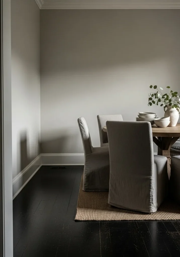 This dining room pairs soft greige walls with deep, dark wood floors for a look that feels calm and grounded. The subtle wall paneling adds just enough detail without stealing attention from the beautiful wood tones. Natural light filters in gently and keeps the space from feeling heavy or too formal.