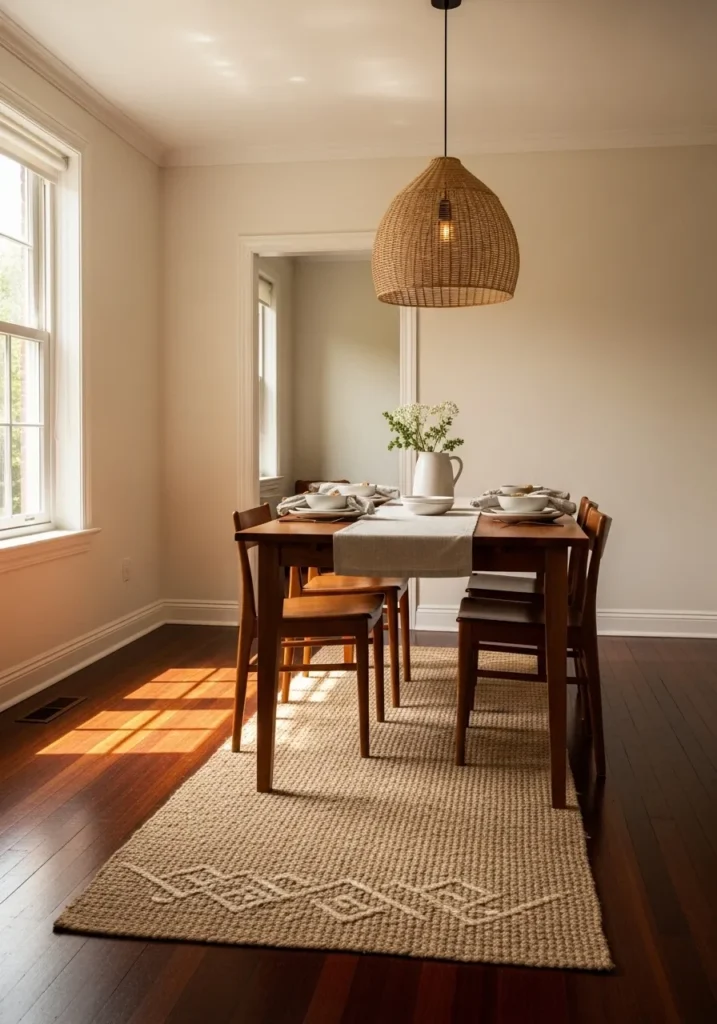 Creamy sand colored walls brighten this dining room while still letting the dark floors stand out. Natural light pours in and highlights the soft textures of the rug and wood furniture. The overall look feels light but still grounded.