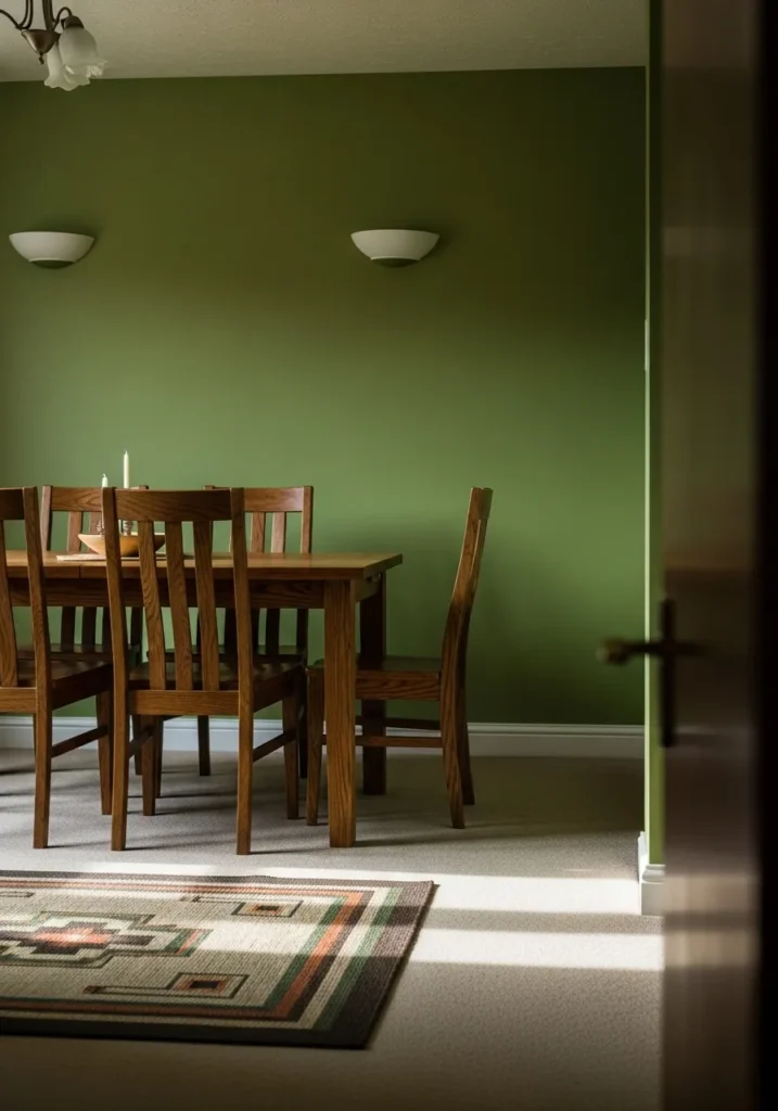 This dining room uses a deep olive green paint that instantly adds depth and warmth to the space. The dark wood table and chairs feel sturdy and classic, and the simple rug and soft lighting keep the room grounded and inviting without feeling heavy or overdone. Natural light sneaks in and softens the bold wall color, making the space feel calm and balanced.