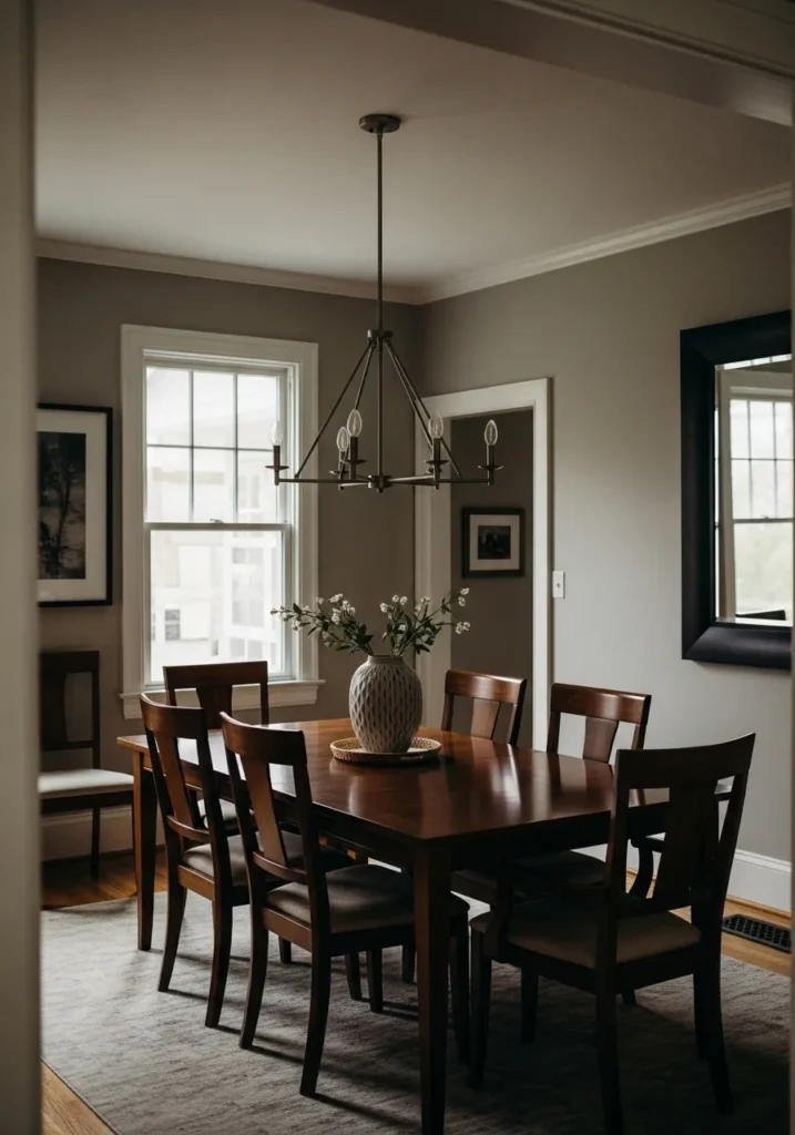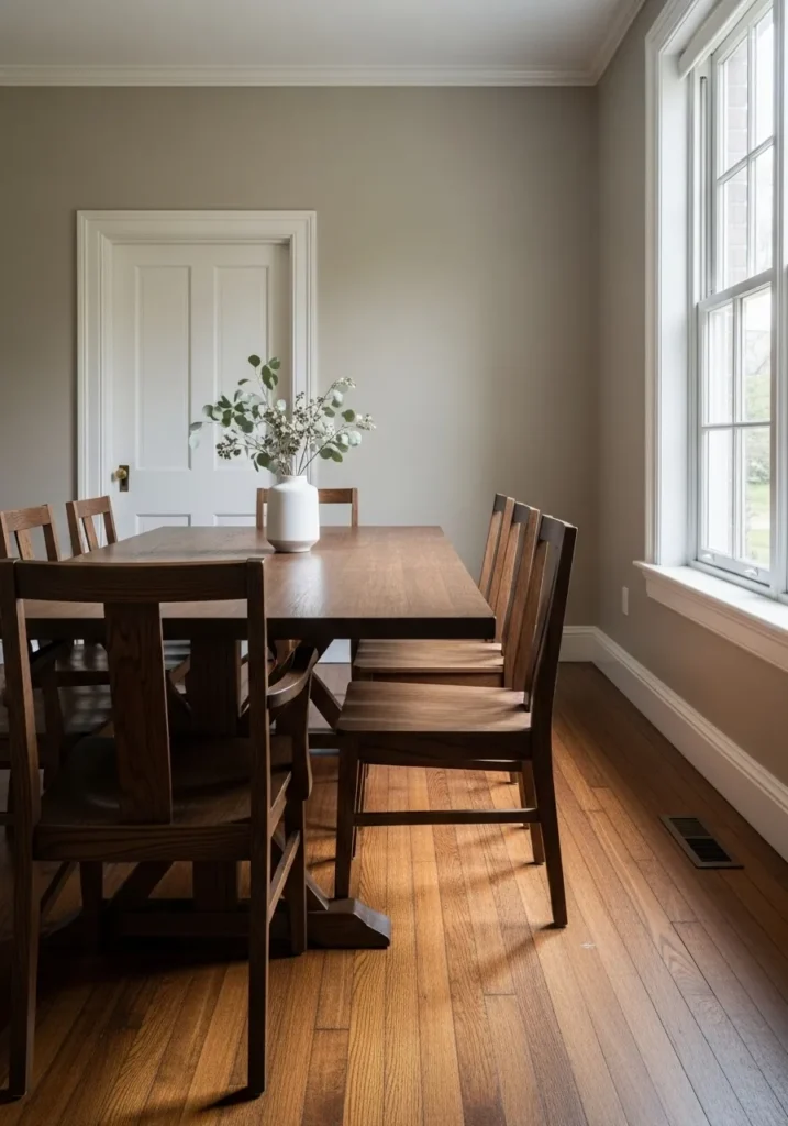 This dining room features a soft neutral gray paint that creates a calm and understated backdrop. The dark wood dining set adds contrast and warmth, while simple lighting and minimal decor keep the space feeling clean and relaxed. Natural light helps soften the gray and brings the room to life.