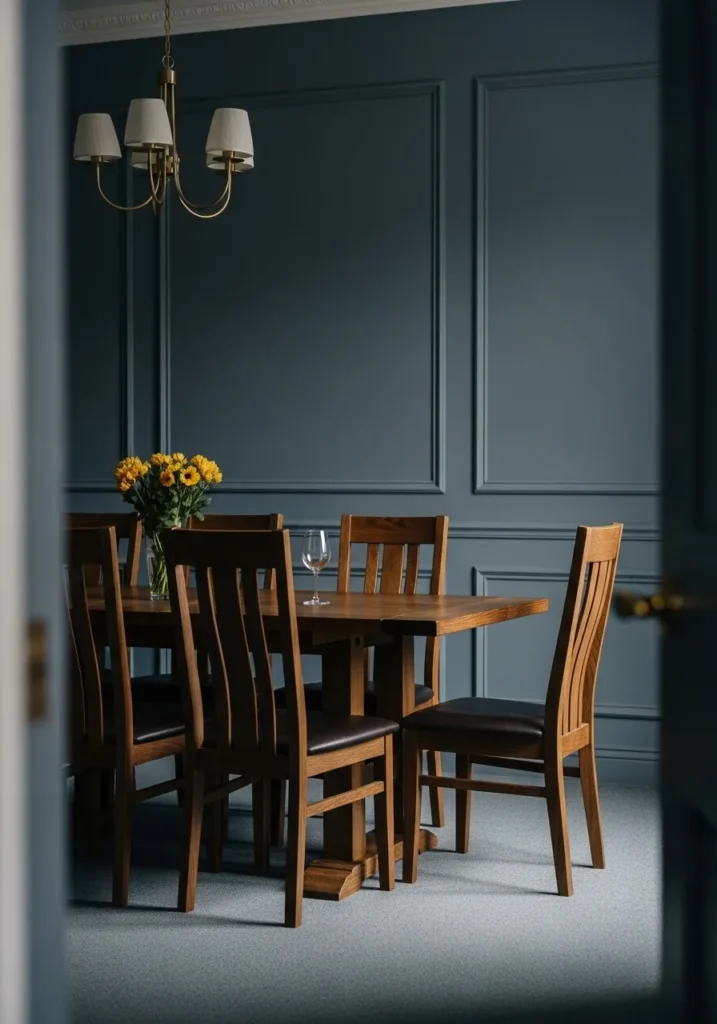 This dining room features deep blue walls that add richness without overwhelming the space. The dark wood table and chairs sit comfortably against the bold color, while traditional lighting and simple styling keep the look timeless. The balance between color and wood feels very intentional.