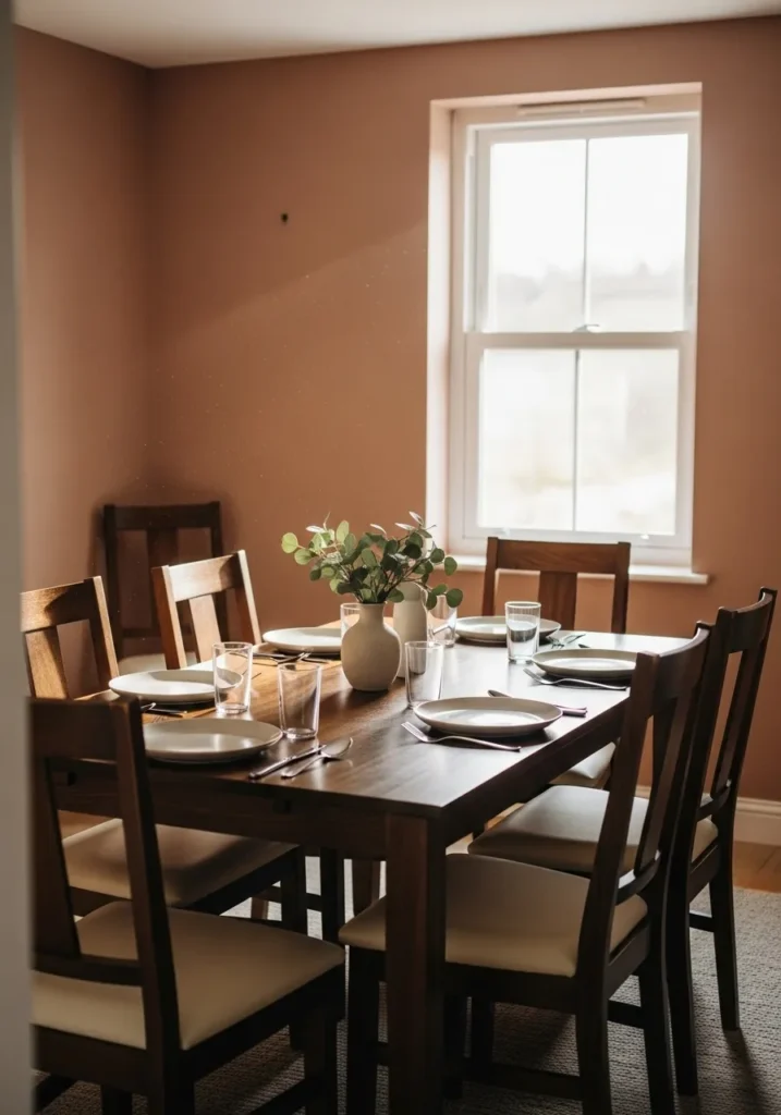 This dining room is painted in a soft clay tone that brings warmth without overpowering the space. The dark wood table and chairs stand out beautifully against the muted walls, and the natural light adds a soft glow that makes the room feel relaxed and welcoming. Everything feels simple and thoughtfully placed.