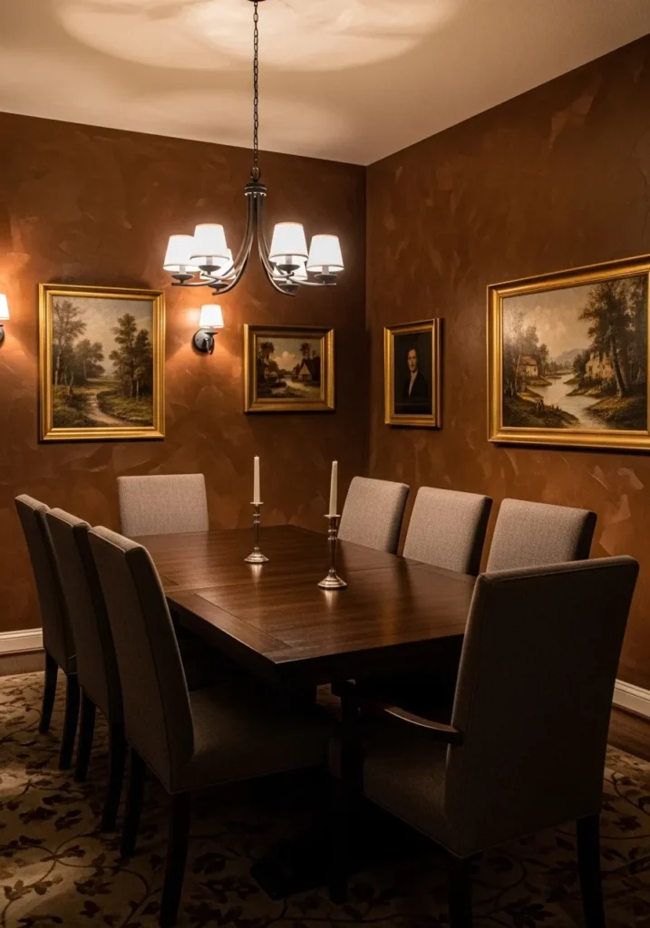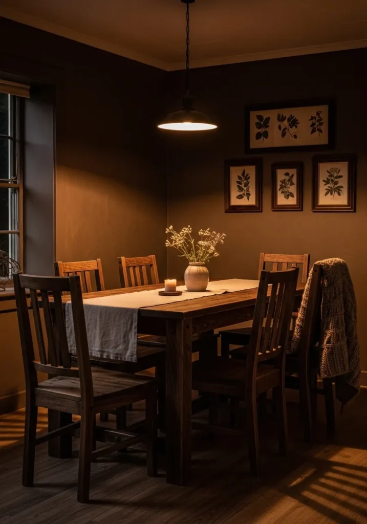 This dining room is painted in a warm brown tone that feels especially inviting under soft evening lighting. The dark wood table and chairs blend beautifully with the walls, creating a layered and cohesive look. Framed artwork and simple decor add personality without distracting from the rich color palette.