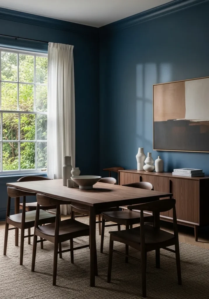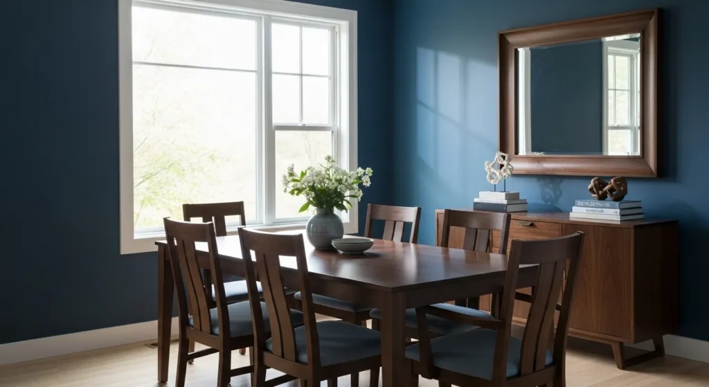 This dining room is painted in a rich deep blue that instantly adds depth and warmth. The dark wood table and chairs feel classic and sturdy, and the soft curtains and warm lighting help balance out the bold wall color. Natural light coming through the window keeps the room from feeling too heavy.