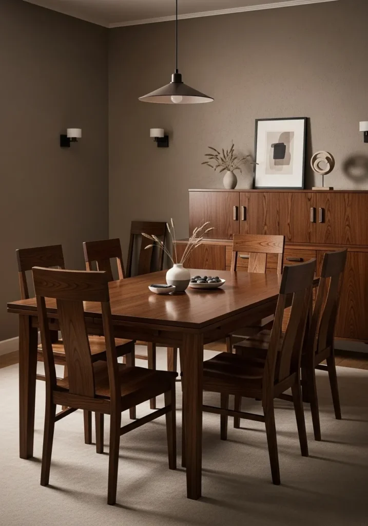 This dining room features warm taupe walls that create a cozy and inviting backdrop for the dark wood furniture. The wooden table has a slightly rustic feel, paired with simple chairs and soft lighting that adds warmth without overpowering the space. Natural textures and muted tones keep everything feeling balanced and lived in.