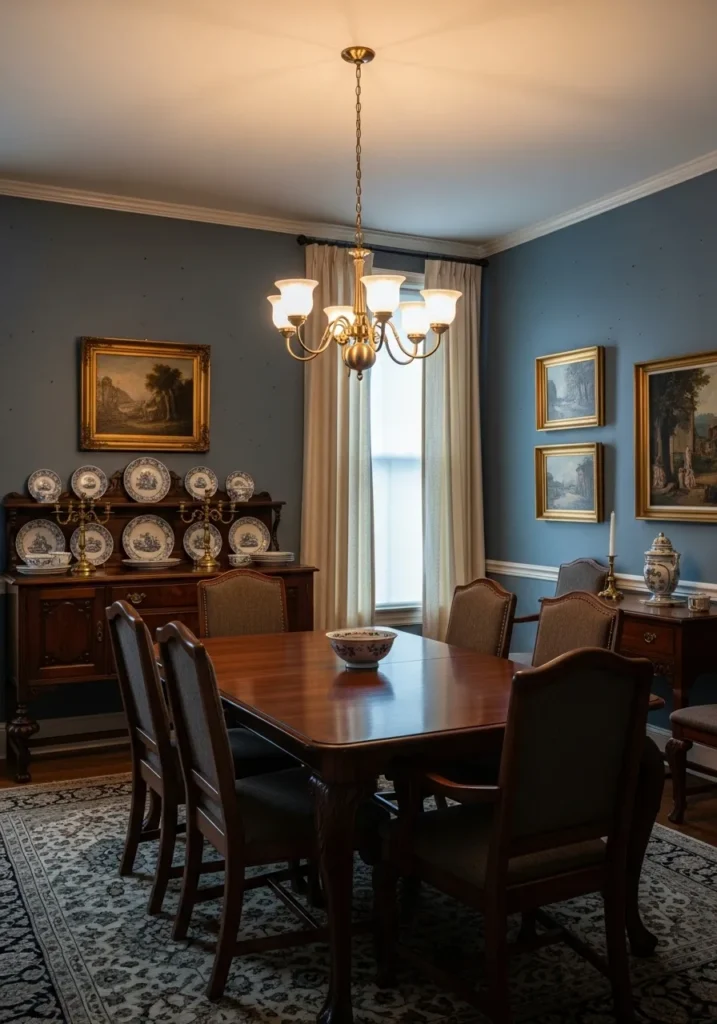 This dining room uses a classic medium blue paint that pairs effortlessly with dark wood furniture. The traditional dining table and chairs are complemented by warm lighting, framed art, and a patterned rug that adds texture. Everything feels balanced and thoughtfully placed.