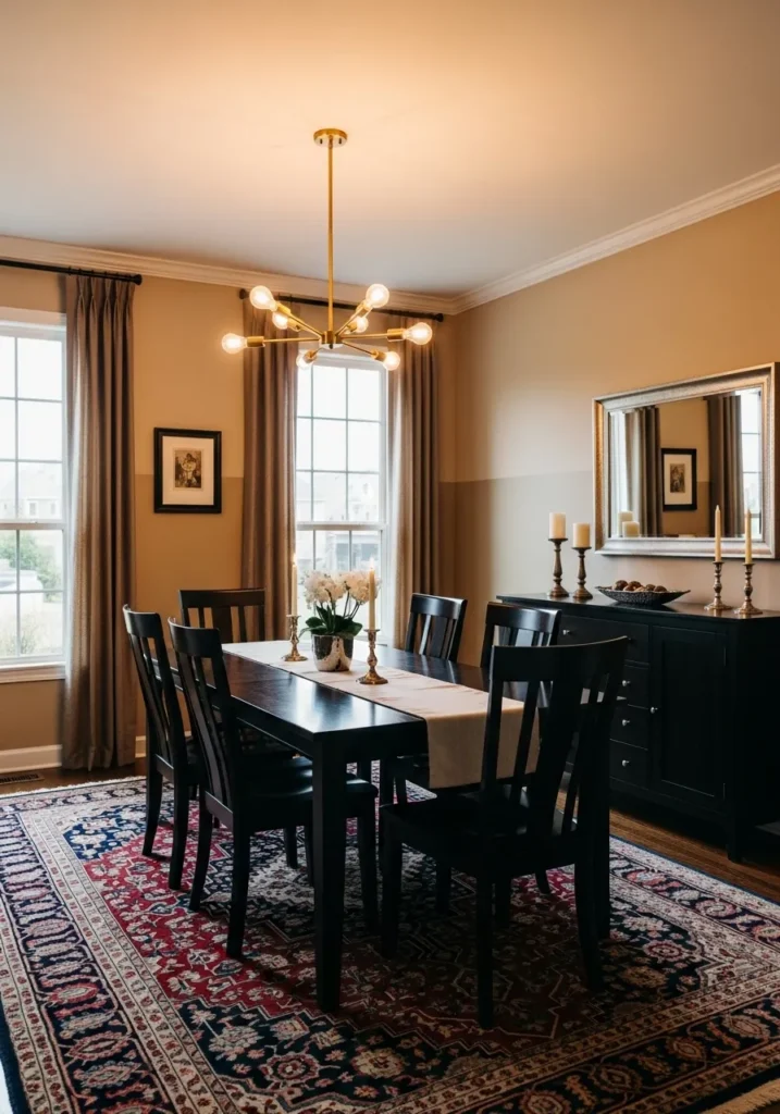 This dining room is painted in a warm golden tone that instantly brightens the space. The dark wood table and chairs stand out beautifully against the lighter walls, while layered lighting and a patterned rug add warmth and personality. The overall look feels welcoming and lived in.