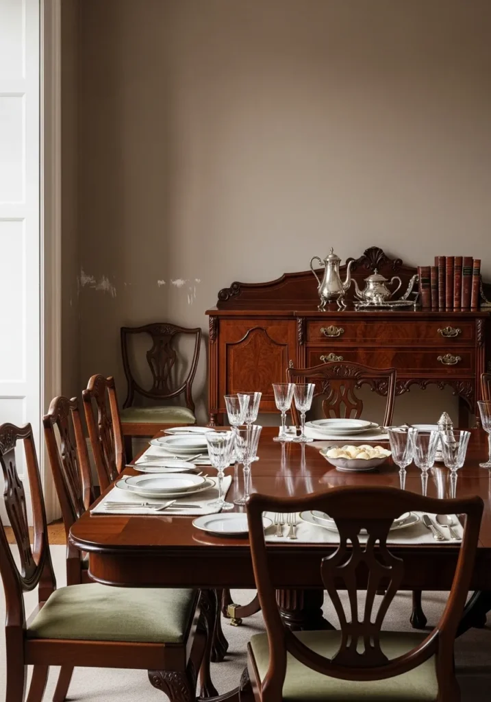 This dining room uses a refined taupe wall color that pairs beautifully with richly detailed dark wood furniture. The carved chairs, polished table, and classic sideboard give the space a heritage feel, while the simple table setting keeps it from feeling heavy. Soft daylight highlights the craftsmanship and warmth of the wood.