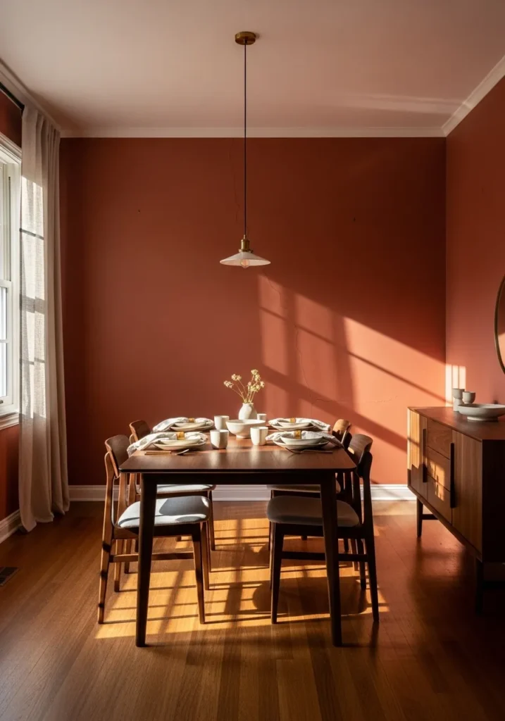 This dining room features rich terracotta walls that add instant warmth and personality. The dark wood table and chairs contrast beautifully with the earthy paint color, while the sunlight creates soft shadows that make the space feel layered and inviting. The overall look feels grounded and cozy without looking dated.