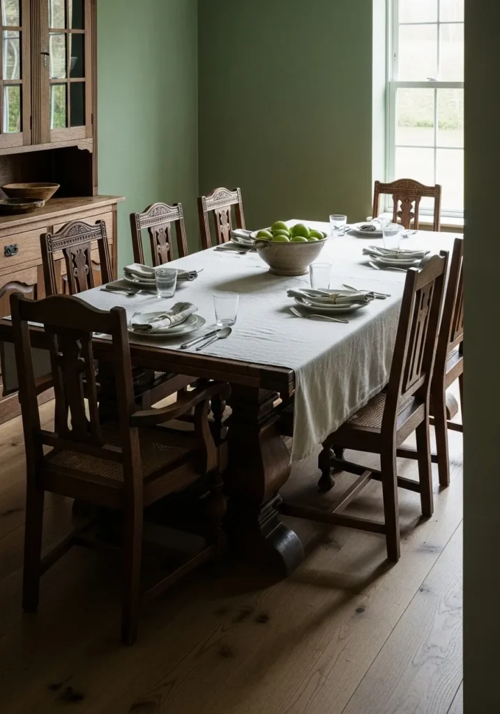 I love how natural this space feels. The green walls soften the dark wood and make everything feel connected and peaceful. It feels like a room designed for real life, where meals are shared and memories quietly pile up.