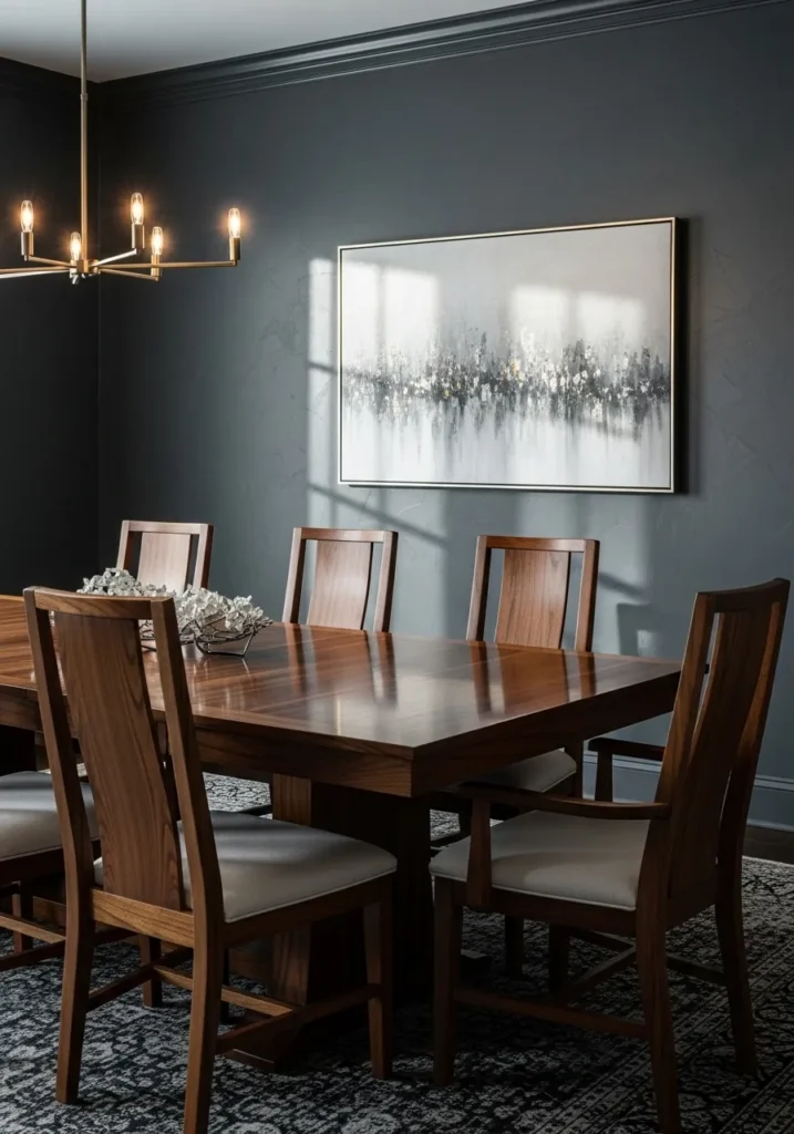 I am a big fan of dark gray walls when they are done like this. They make dark wood furniture look bold and intentional instead of heavy. This room feels stylish and confident, the kind of space that makes even a simple dinner feel a little more special.