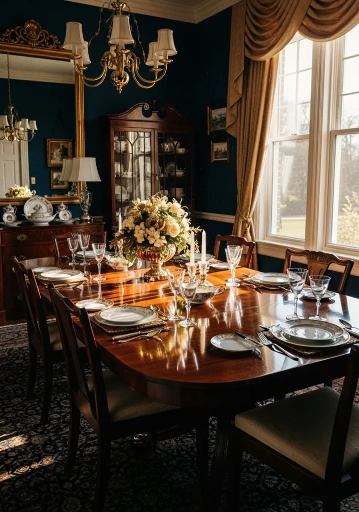 This dining room is wrapped in a deep navy paint that instantly sets a dramatic and elegant tone. The dark wood table shines under soft chandelier lighting, and the classic chairs and layered table setting give the space a formal yet welcoming feel. Tall windows let in natural light that keeps the dark walls from feeling too heavy and adds a beautiful contrast to the rich wood tones.