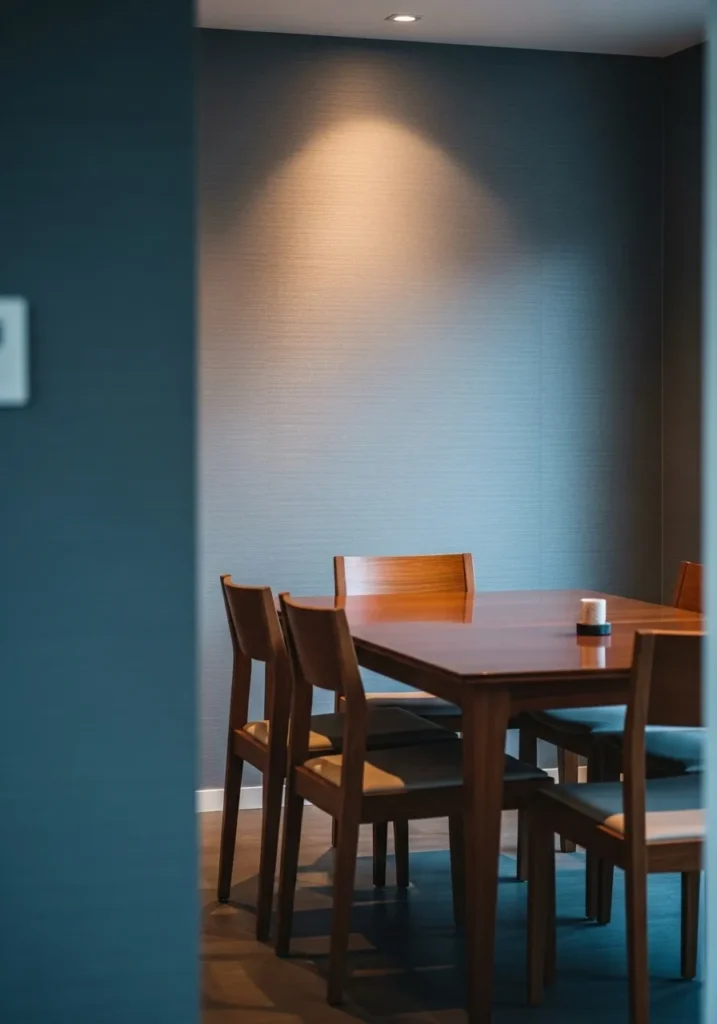 This space uses a cool blue gray wall color that gives the dining room a calm and understated look. The dark wood table and chairs keep things grounded, while the simple layout and minimal decor make the room feel modern and uncluttered. Soft lighting adds warmth and keeps the overall vibe relaxed.