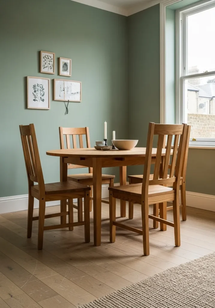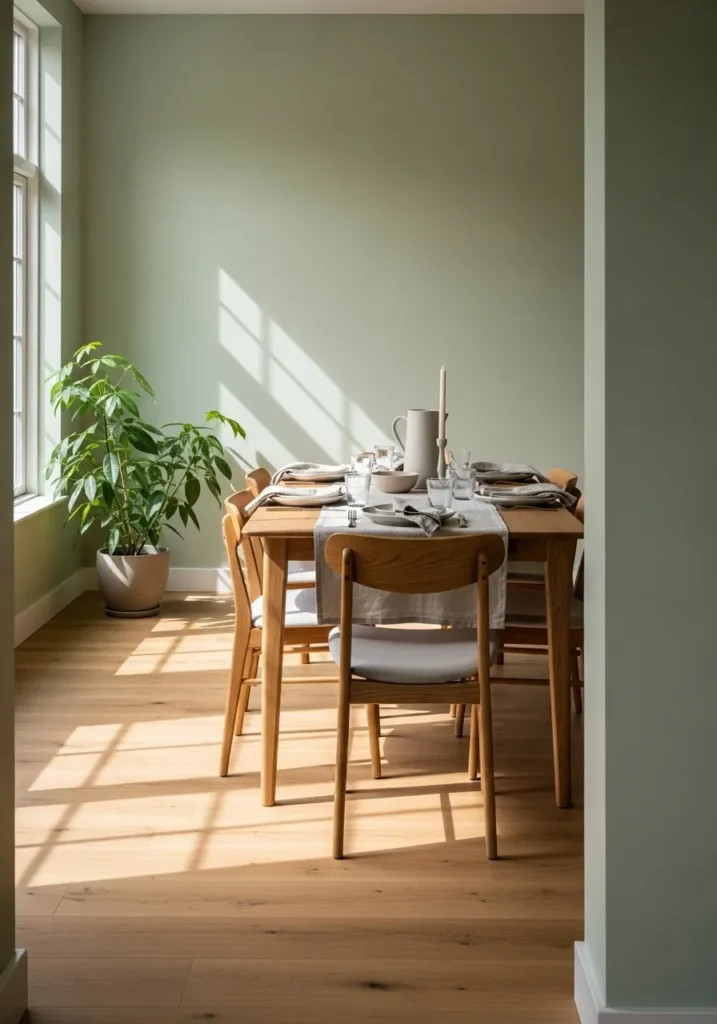 This dining room features soft olive green walls that feel calm and earthy without darkening the space. Light wood furniture keeps everything airy and grounded, while sunlight streaming through the window creates warm patterns across the floor. The simple table setting and subtle greenery add a lived in feel that feels natural and relaxed. The overall look is quiet and inviting, perfect for everyday dining.