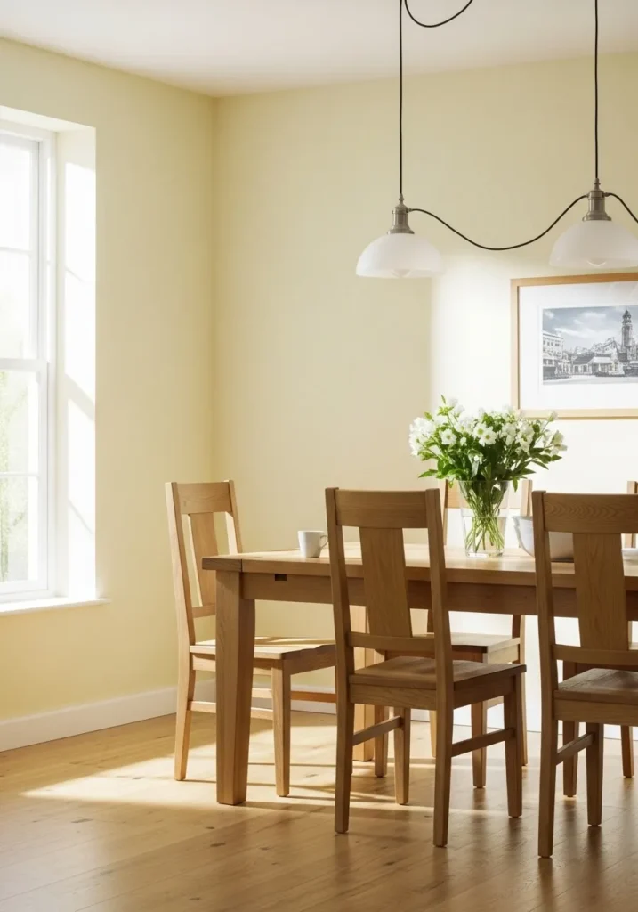 This dining room is painted in a soft yellow shade that instantly brightens the space. Light wood furniture enhances the cheerful feel while keeping everything simple and airy. Natural light reflects off the walls, making the room feel warm and open. The minimal lighting fixture adds charm without overpowering the space.